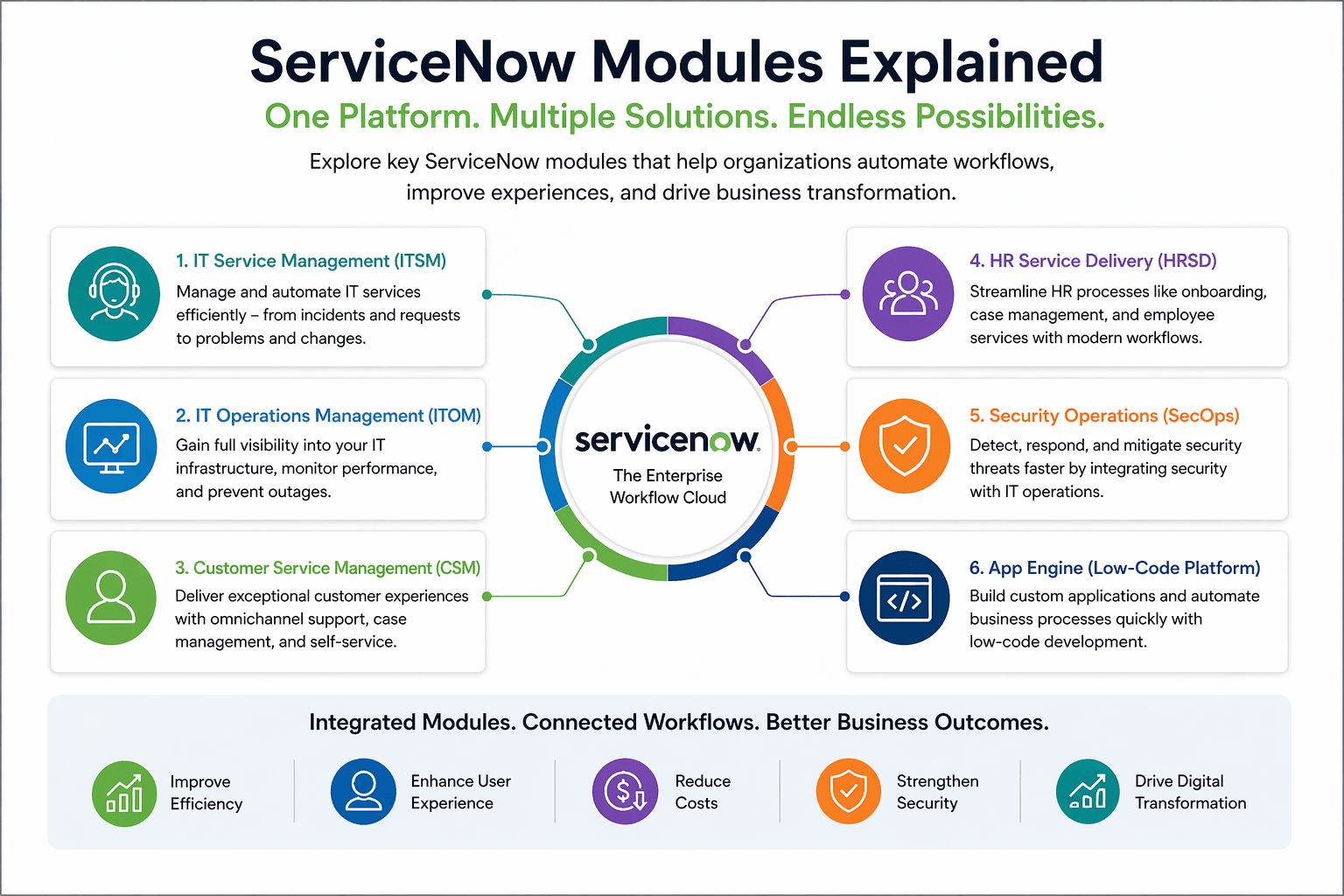 Explore key ServiceNow modules including ITSM, ITOM, CSM, HRSD, and SecOps. Learn how each module helps businesses streamline workflows and improve efficiency.